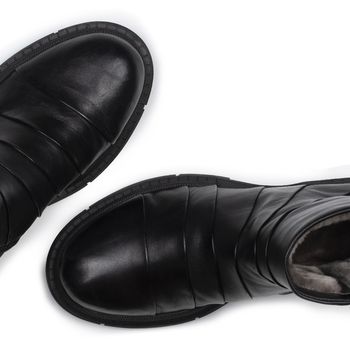 Ботинки из нежной перчаточной кожи, оформленные объемными складками, будут уместны в любом повседневном образе. Модель утеплена шелковистым мехом, толстая подошва с бортиками и протектором не пропускает холод внутрь и минимизирует скольжение. Ботинки застегиваются на боковую молнию. Деталь скрытый эластик позволяет скорректировать посадку.