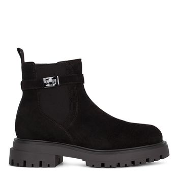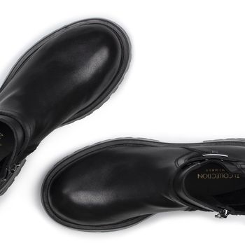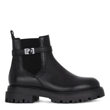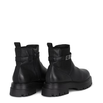 Черные кожаные челси очень практичны – прежде всего, благодаря массивной резиновой подошве с глубоким протектором, не пропускающей холод и обеспечивающей отменное сцепление. Стелька выполнена из экокожи. Боковая эластичная вставка – для оптимальной посадки по голеностопу. Модель оформлена ремешком и декоративной пряжкой из металла. Деталь в пяточной зоне петля для удобного надевания.