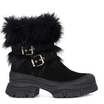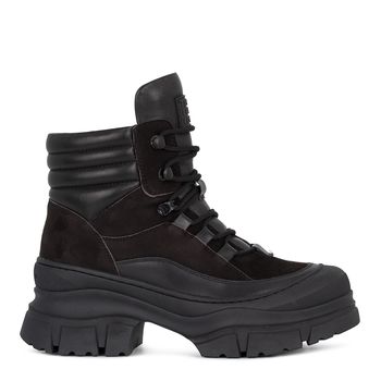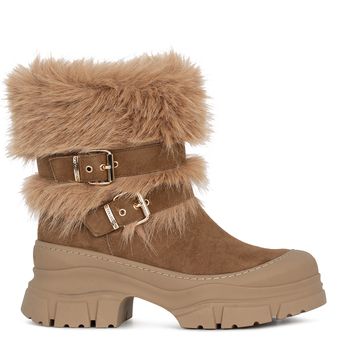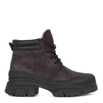 Короткие ботинки на меху выполнены в сложном оттенке rose taupe, который особенно хорош в замше. Круглый мыс и корпус модели отделан резиновой накладкой, защищающей пару от слякоти и реагентов. Мягкие кожаные вставки в тон делают посадку особенно комфортной. Мощная подошва изготовлена из амортизирующей износоустойчивой резины с хорошим сцеплением.